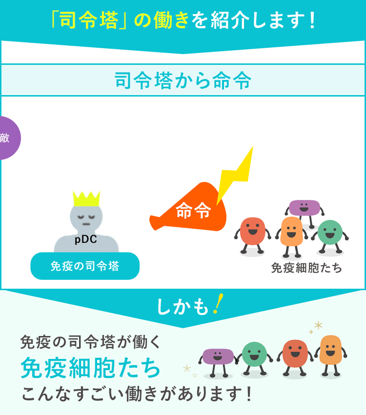 プラズマ乳酸菌が健康な人の免疫機能の維持をサポートするメカニズム 免疫の司令塔pDC活性化指標 免疫の司令塔は、普段眠っており、外敵が入ってくると活性化します。プラズマ乳酸菌を摂ることが、免疫の司令塔を応援し、健康でいる助けになります。
